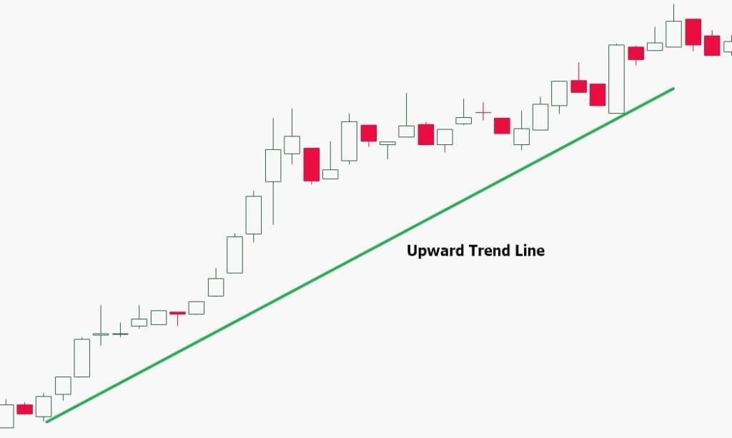 An upward trend line is like a ladder going up, showing that prices are generally increasing over time. It’s like climbing steps where each one is a bit higher than the last. For traders, this is a good sign to buy because they expect prices to keep going up. It’s like being on an escalator that’s moving in the upward direction.