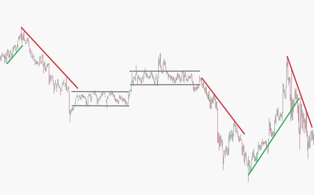 A sideways trend in the market occurs when prices largely fluctuate within a defined range, showing neither significant upward nor downward movement. It resembles a flat road, where prices remain relatively stable, lacking a clear direction towards either ascent or descent.